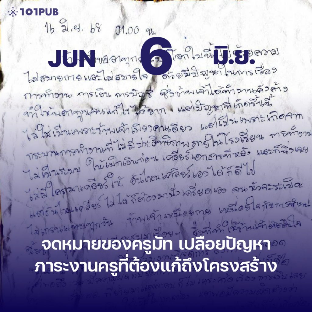 จดหมายของครูอนุสรา ชวนรัมย์ ข้าราชการครูในจังหวัดบุรีรัมย์ที่ตัดสินใจจบชีวิตลงเมื่อเดือนมิถุนายนที่ผ่านมา ระบุถึงภาระงานที่นอกเหนือไปจากการสอนที่บั่นทอนสุขภาพของเธอถึงขั้น ‘เสี่ยงชีวิต’