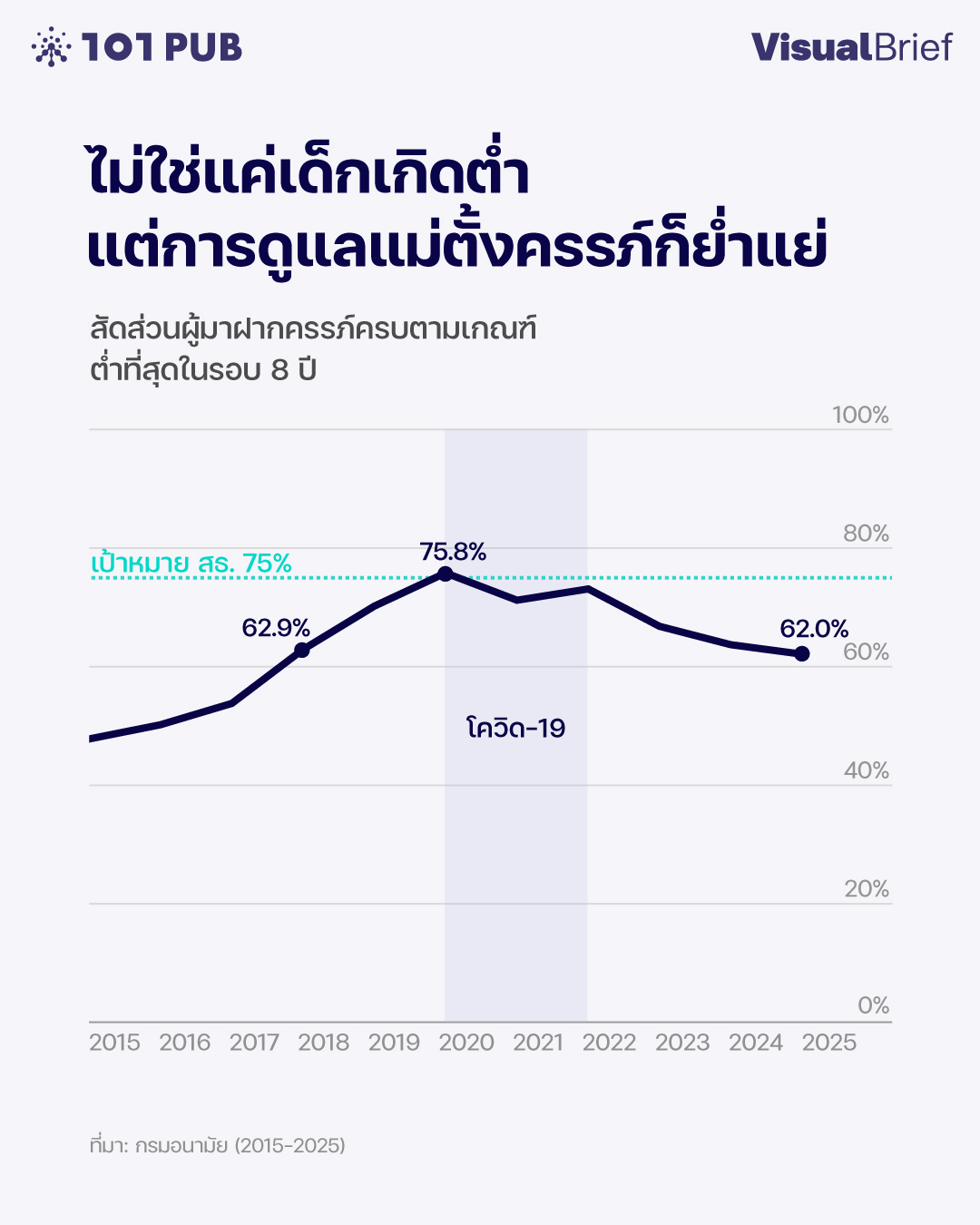 ปี 2025 ไทยมีคนเกิดน้อยกว่าคนตายติดต่อกันเป็นปีที่ 5 จัดอยู่ในกลุ่มประเทศที่มีอัตราเจริญพันธ์ต่ำที่สุดในโลก แต่สิ่งที่น่ากังวลยิ่งกว่าจำนวนเด็กเกิดใหม่ที่ลดน้อยถอยลงทุกปี คือคุณภาพของการตั้งครรภ์ก็ย่ำแย่ลงด้วย เห็นได้จากอัตราการเข้ารับฝากครรภ์ครบตามเกณฑ์ที่ลดลงเหลือเพียง 62.0% ของแม่ตั้งครรภ์ทั้งหมด ซึ่งถือว่าต่ำที่สุดในรอบ 8 ปี