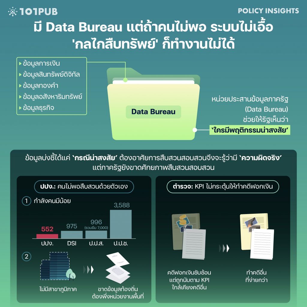 ในเบื้องต้น ถึงแม้ว่า Data Bureau ที่กำลังจะเกิดขึ้นยังเป็นระบบที่ไม่สมบูรณ์ยังต้องปรับปรุงบูรณาการเพิ่มข้อมูลอีกหลายแหล่ง (เช่น ข้อมูลการซื้อขายรถยนต์ ข้อมูลการซื้อขายของสะสม ฯลฯ) และต้องหาวิธีทำให้ข้อมูลที่มีอยู่แล้วจากหลายภาคส่วนมีความครบถ้วนมากยิ่งขึ้น[10]เช่น ข้อมูลสินทรัพย์ดิจิทัล ข้อมูลเงินสด ที่ระบบในปัจจุบันยังบันทึกได้ไม่ครอบ เสาวลักษณ์ เขตสูงเนิน, ประลองยุทธ ผงงอย และปวริศ อำนวยพรไพศาล. … Continue reading แต่ก็เป็นการยกระดับกลไกข้อมูลเพื่อใช้ตรวจจับทุนผิดกฎหมายในทิศทางที่ถูกต้องแล้ว