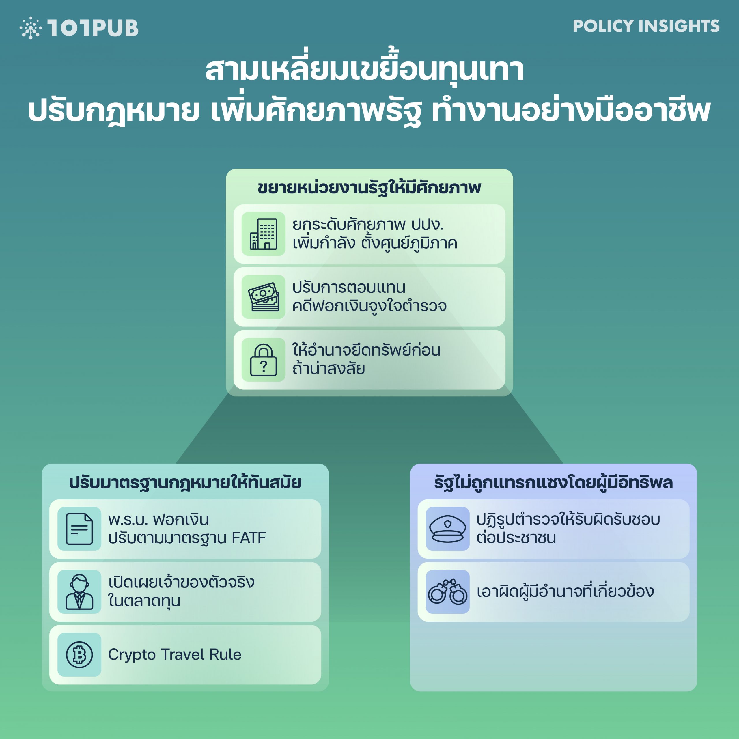 ประการแรก ปรับกฎหมายเพิ่มอำนาจรัฐในการตรวจจับการฟอกเงิน ซึ่งกำลังเป็นประเด็นสำคัญที่สังคมผลักดันอยู่แล้ว