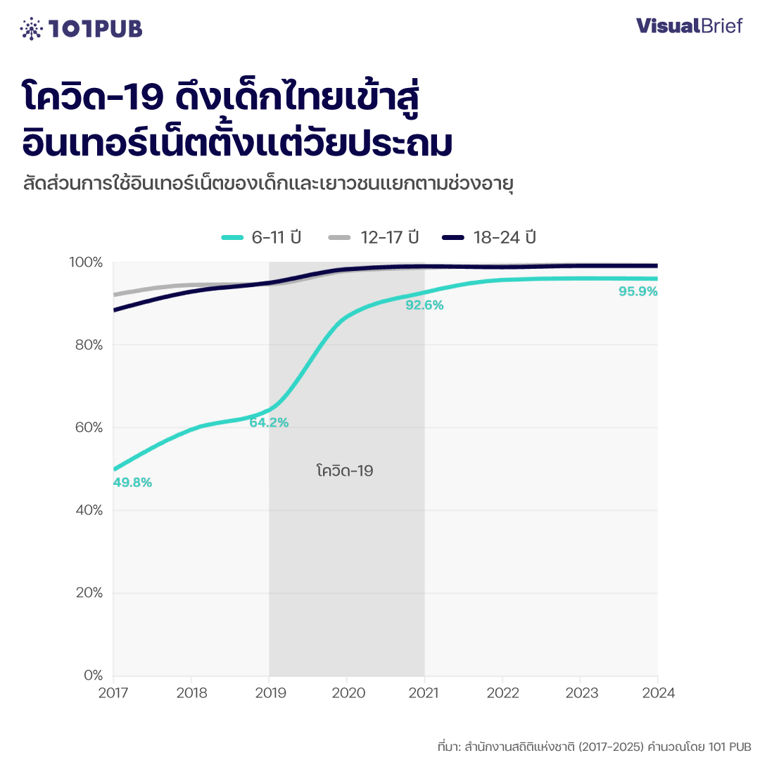 สาเหตุหนึ่งของกระแสสุดพิลึกนี้ อาจเป็นผลมาจากการเพิ่มขึ้นของ ‘ชาวเน็ตฟันน้ำนม’ หรือเด็กอายุ 6-11 ปี ที่เข้าถึงอินเทอร์เน็ตมากขึ้นอย่างที่ไม่เกิดขึ้นมาก่อน อันเป็นผลโดยตรงจากการควบคุมโรคระบาดโควิด-19 เมื่อห้าปีที่แล้ว ย้อนกลับไปเมื่อปี 2017 เด็กไทยวัยนี้เข้าถึงอินเทอร์เน็ตเพียงครึ่งหนึ่งเท่านั้น การล็อคดาวน์และเรียนออนไลน์ในช่วงปี 2020-2021 หยิบยื่นอุปกรณ์และเปิดประตูสู่โลกอินเทอร์เน็ตให้กับเด็กวัยประถมเพิ่มขึ้นกว่า 1.2 ล้านคน อัตราการใช้งานจึงพุ่งทะยานขึ้นอย่างรวดเร็ว กระทั่งเพิ่มสัดส่วนเป็น 95.9% ในปัจจุบัน[1]สำนักงานสถิติแห่งชาติ. 2017-2024. คำนวณโดย 101 PUB