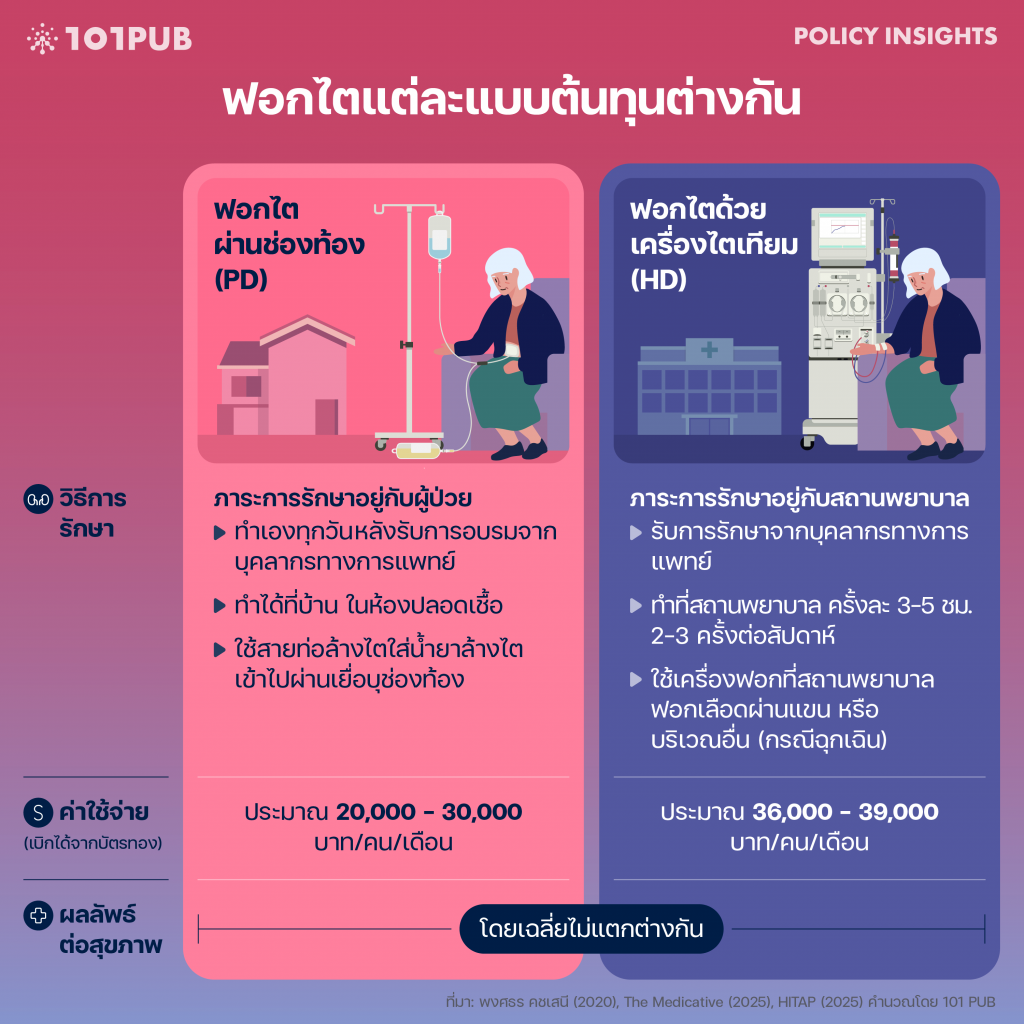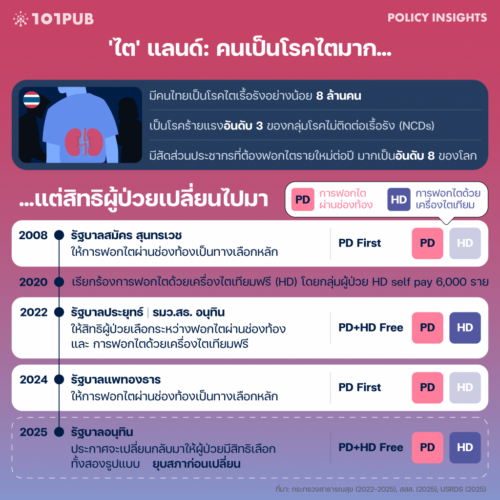 ประเทศไทยเริ่มเปิดสิทธิในการบำบัดทดแทนไตครั้งแรกในปี 2008[6]มติชน, “มหากาพย์เรื่อง ‘ล้างไตฟรี’ ในระบบบัตรทอง (1),” มติชน, 3 พฤศจิกายน 2025, https://www.matichon.co.th/local/quality-life/news_5439057 โดยเป็นการฟอกไตทางช่องท้อง (peritoneal dialysis; PD) ภายใต้หลักประกันสุขภาพแห่งชาติฟรีเป็นทางเลือกแรก (PD First) โดยกรณีที่มีข้อบ่งชี้ว่าไม่สามารถฟอกไตทางช่องท้องได้ จึงจะสามารถการฟอกไตด้วยเครื่องไตเทียม[7]การฟอกไตประกอบด้วย 2 วิธีหลัก ได้แก่ การล้างไตทางช่องท้องและการฟอกเลือดด้วยเครื่องไตเทียม … Continue reading (hemodialysis: HD) ดังนั้นหากผู้ป่วยไม่สมัครใจฟอกไตทางช่องท้องและแพทย์ไม่เห็นถึงความจำเป็นในการฟอกไตด้วยเครื่องไตเทียมแต่ต้องการเลือกทำ จึงต้องรับผิดชอบค่าใช้จ่ายด้วยตนเอง