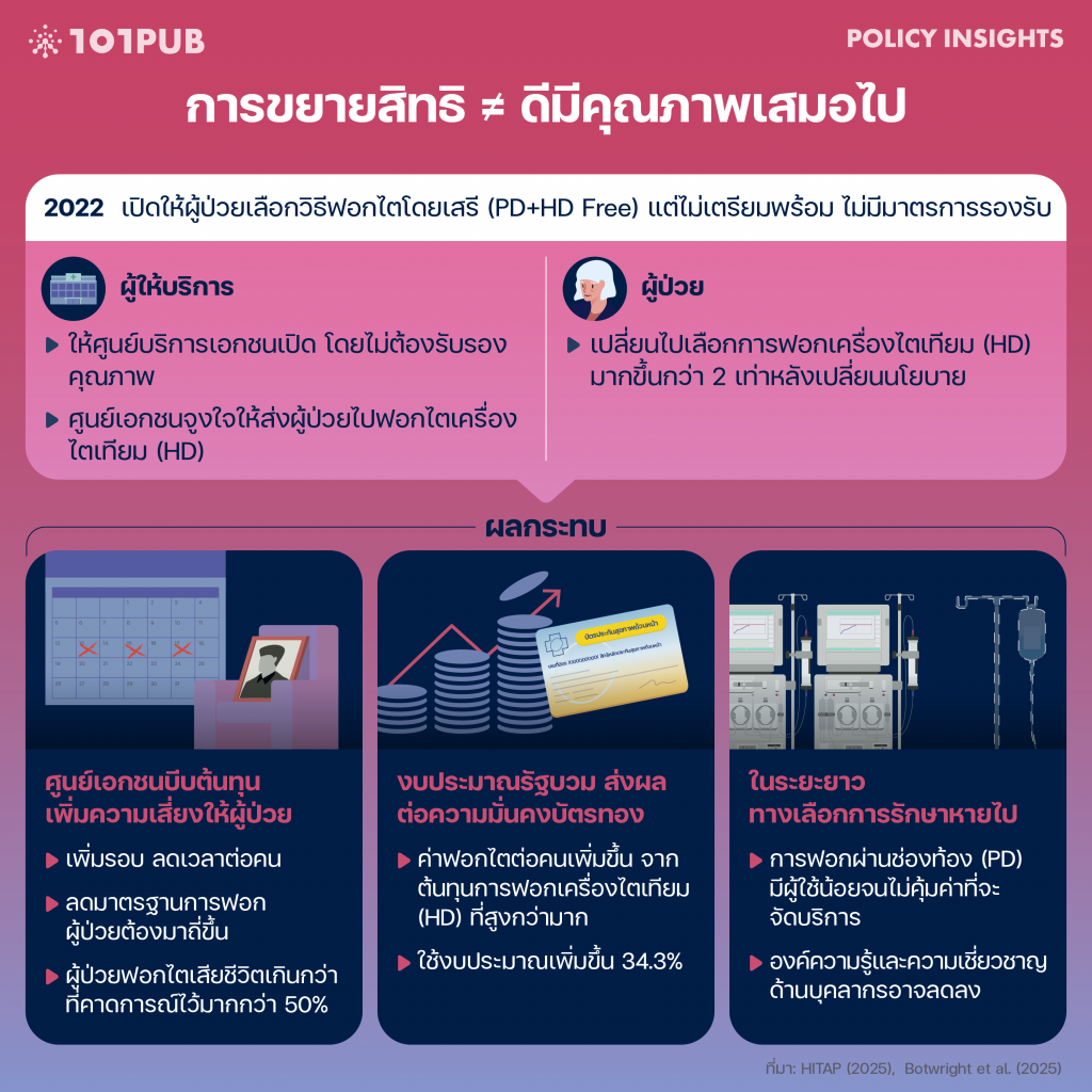 101 PUB ชวนถอดบทเรียนจากนโยบายฟอกไตฟรี การขยายสิทธิรักษาฟรีภายใต้ระบบบัตรทองไม่อาจพิจารณาเพียงความครอบคลุมทางนโยบายเท่านั้น แต่ต้องคำนึงถึงความยั่งยืนของระบบในระยะยาว เพื่อหลีกเลี่ยงไม่ให้ประชาชนตกอยู่ภายใต้นโยบายที่เน้นการ ‘เปิดสิทธิฟรีทั้งหมด’ โดยไม่ประเมินต้นทุน ความสมดุล และผลกระทบต่อระบบสุขภาพโดยรวม