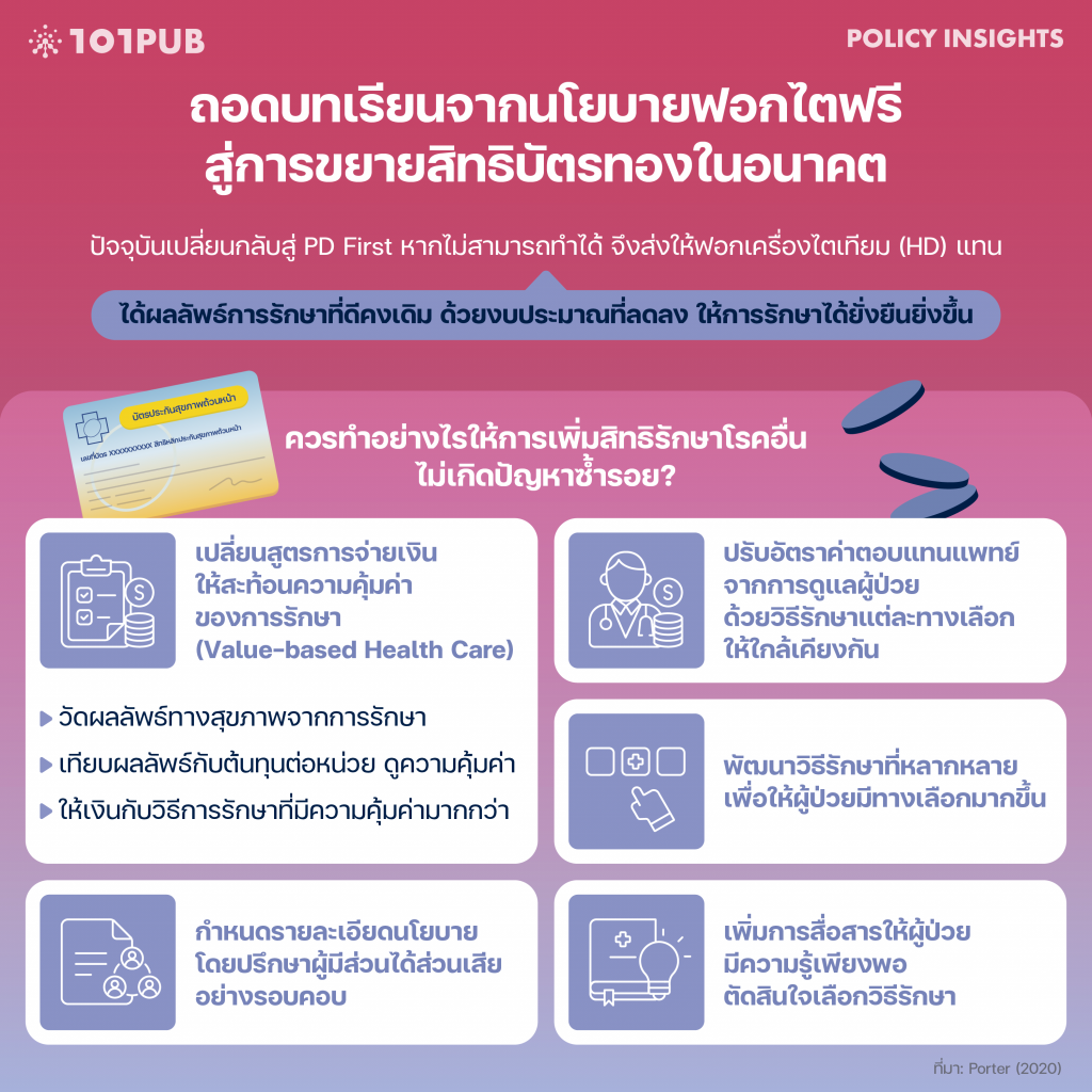 - ต้นทุนทางสังคมและความเสียหายที่ไม่คาดคิดเป็นบทเรียนสำคัญที่ไม่ควรปล่อยให้เกิดซ้ำอีก โดยแนวทางควรผลักดัน เช่น เปลี่ยนสูตรการจ่ายเงินให้สะท้อนความคุ้มค่าของการรักษา ยกระดับระบบบริการสุขภาพควรปรับโครงสร้างการให้บริการเป็นการจัดตามปัญหาและวงจรการรักษาของผู้ป่วย ฯลฯ