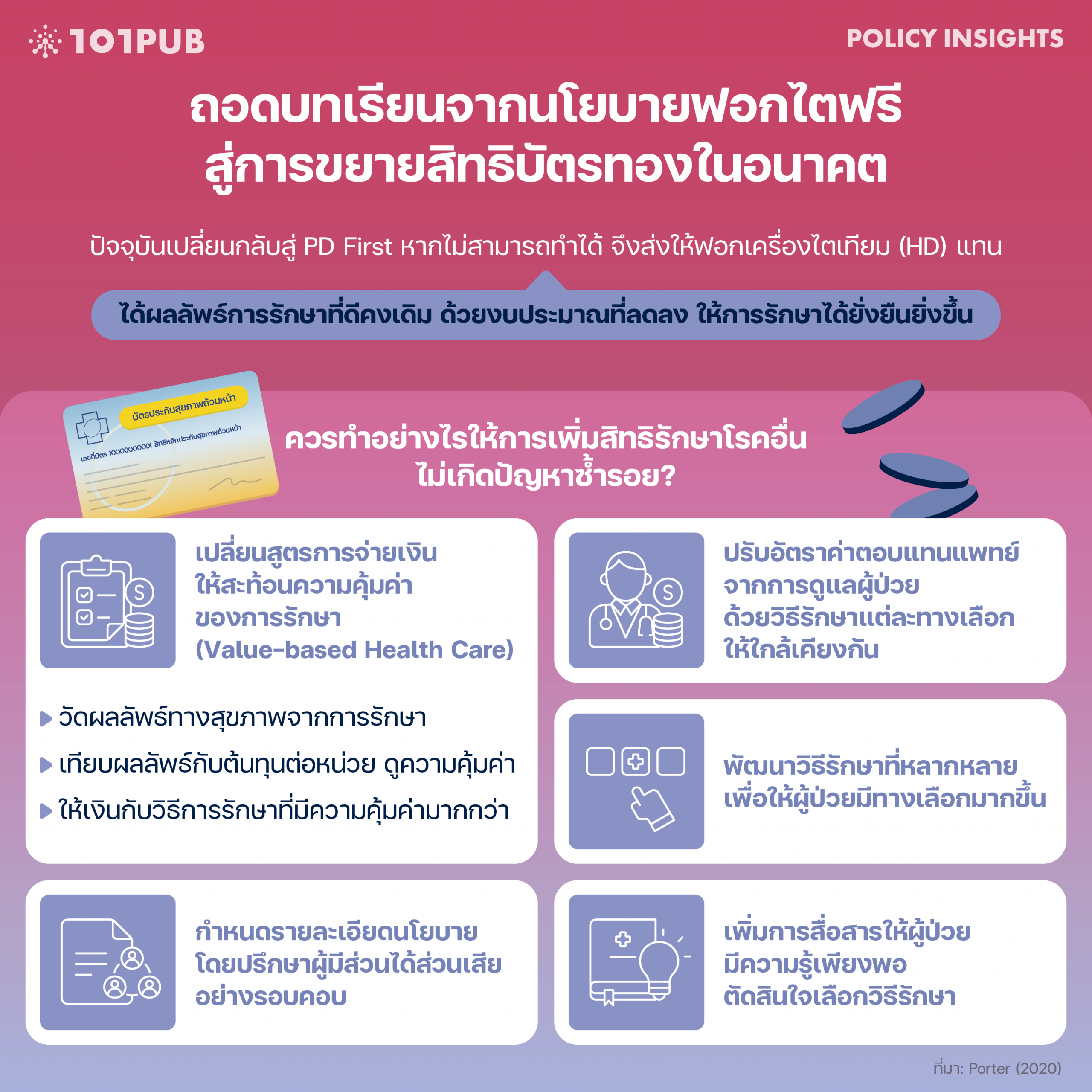 - ต้นทุนทางสังคมและความเสียหายที่ไม่คาดคิดเป็นบทเรียนสำคัญที่ไม่ควรปล่อยให้เกิดซ้ำอีก โดยแนวทางควรผลักดัน เช่น เปลี่ยนสูตรการจ่ายเงินให้สะท้อนความคุ้มค่าของการรักษา ยกระดับระบบบริการสุขภาพควรปรับโครงสร้างการให้บริการเป็นการจัดตามปัญหาและวงจรการรักษาของผู้ป่วย ฯลฯ