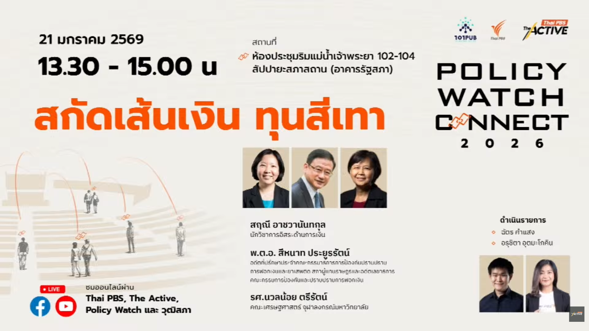 ชวนสำรวจกลไกปราบปรามการฟอกเงินของไทยว่าบกพร่องที่จุดไหน และจะสามารถพัฒนากลไกเพื่อให้ประเทศไทยปลอดจากภัยทุนสีเทาได้มากขึ้นได้อย่างไร ภายในงาน Policy Watch Connect โดย 101 PUB และ The Active