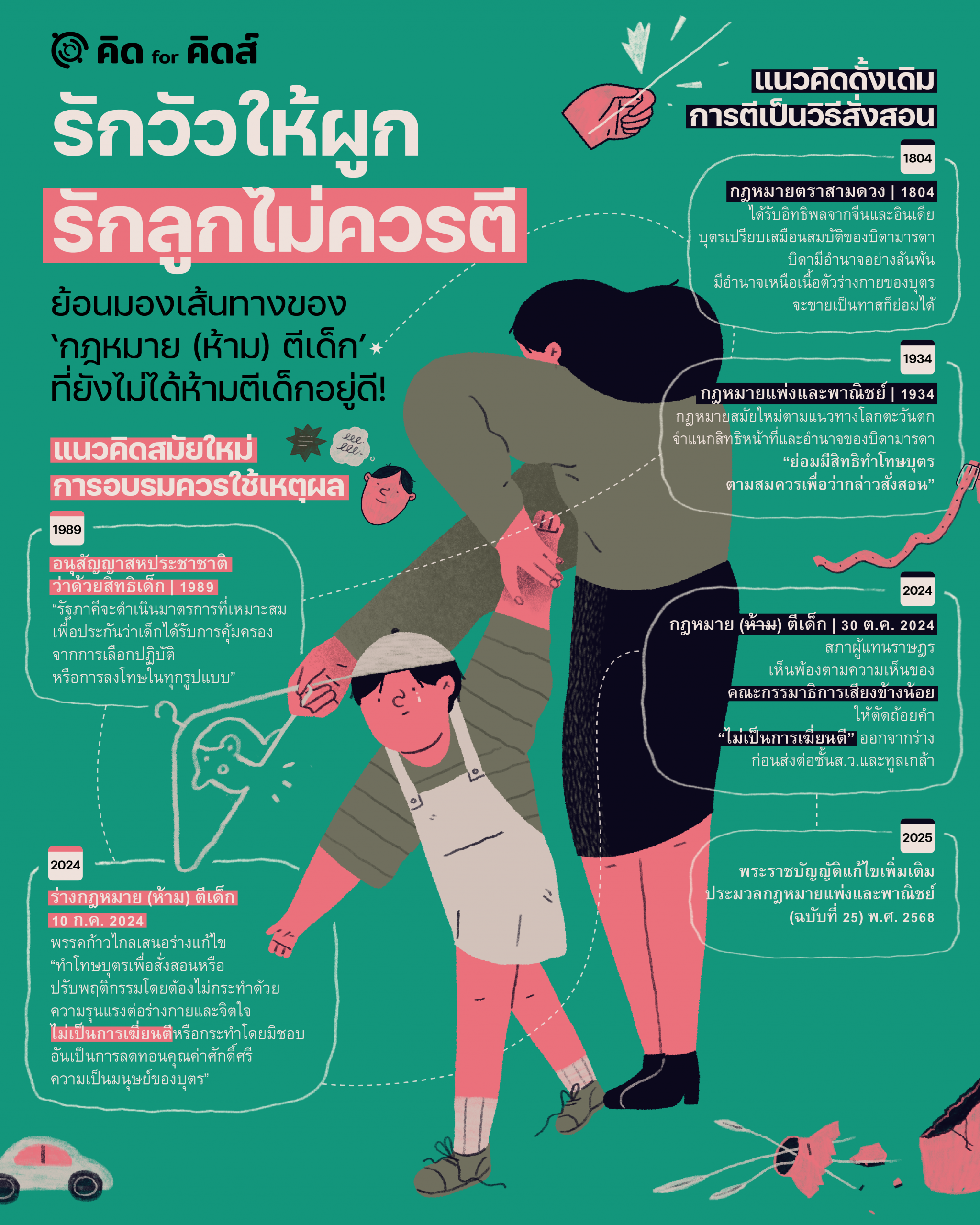 คิด for คิดส์ โดยความร่วมมือของ สสส. กับ 101 PUB ขอนำเสนอพัฒนาการเกี่ยวกับการใช้อำนาจปกครองบุตร โดยเฉพาะในส่วนของสิทธิของบิดามารดาในการทำโทษบุตร ผ่านเจตนารมณ์ของผู้ร่างกฎหมาย แนวความเห็นทางตำรา และฝ่ายที่เสนอให้ปรับปรุงแก้ไข ในฐานะกรณีศึกษาหนึ่งเกี่ยวกับการต่อสู้ทางความคิดระหว่างฝ่าย ‘รักษาของเก่า’ กับ ‘ปรับปรุงให้ดีขึ้น’ ซึ่งมักปรากฏบ่อยครั้งในการจัดทำกฎหมายครอบครัวสมัยใหม่ของไทย