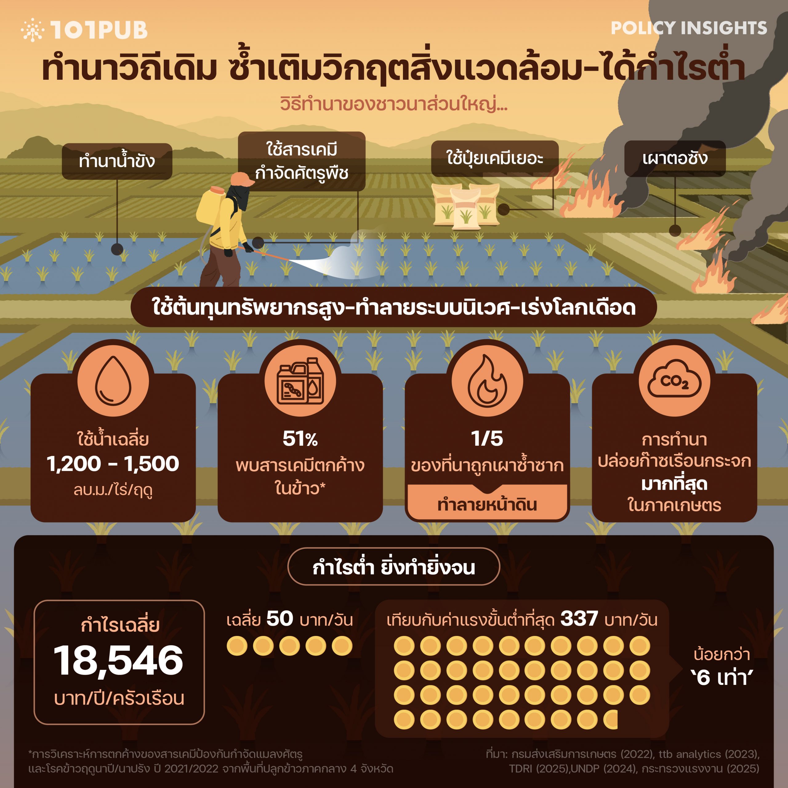 แม้ ‘ข้าว’ เป็นพืชที่เกษตรกรไทยปลูกเยอะที่สุดแต่กลับสร้างรายได้ต่ำไม่พอเลี้ยงปากท้อง มีครัวเรือนเกษตรกรที่ประกอบอาชีพเป็นชาวนาถึงร้อยละ 60.6[1]สำนักงานเศรษฐกิจการเกษตร, การศึกษาแนวทางการสร้างเสถียรภาพการค้าสินค้าข้าว (กรุงเทพฯ: กระทรวงเกษตรและสหกรณ์, 2567) แต่จากการประเมินรายได้สุทธิต่อครัวเรือนเฉลี่ยต่อปีจากการปลูกข้าว ในช่วงปี 2017-2022 พบว่า ชาวนามีกำไรจากการปลูกข้าวเพียง 18,546 บาทต่อปี[2]ttb analytics, “ttb analytics แนะภาคเกษตรไทยทำอย่างไร… ให้ไปได้ไกลกว่าเดิม…,” ttb, 27 เมษายน 2023, https://www.ttbbank.com/th/newsroom/detail/ttb-analytics-agricultural (เข้าถึงเมื่อ 24 ธันวาคม 2025). เฉลี่ยเพียง 50 บาทต่อวัน น้อยกว่าค่าแรงขั้นต่ำที่สุดในปัจจุบันที่ 337 บาทต่อวัน[3]“อัตราค่าจ้างขั้นต่ำ,” กระทรวงแรงงาน, 17 มิถุนายน 2025, https://www.mol.go.th/%E0%B8%AD%E0%B8%B1%E0%B8%95%E0%B8%A3%E0%B8%B2%E0%B8%84%E0%B9%88%E0%B8%B2%E0%B8%88%E0%B9%89%E0%B8%B2%E0%B8%87%E0%B8%82%E0%B8%B1%E0%B9%89%E0%B8%99%E0%B8%95%E0%B9%88%E0%B8%B3 (เข้าถึงเมื่อ 24 ธันวาคม … Continue reading ถึง 6 เท่า