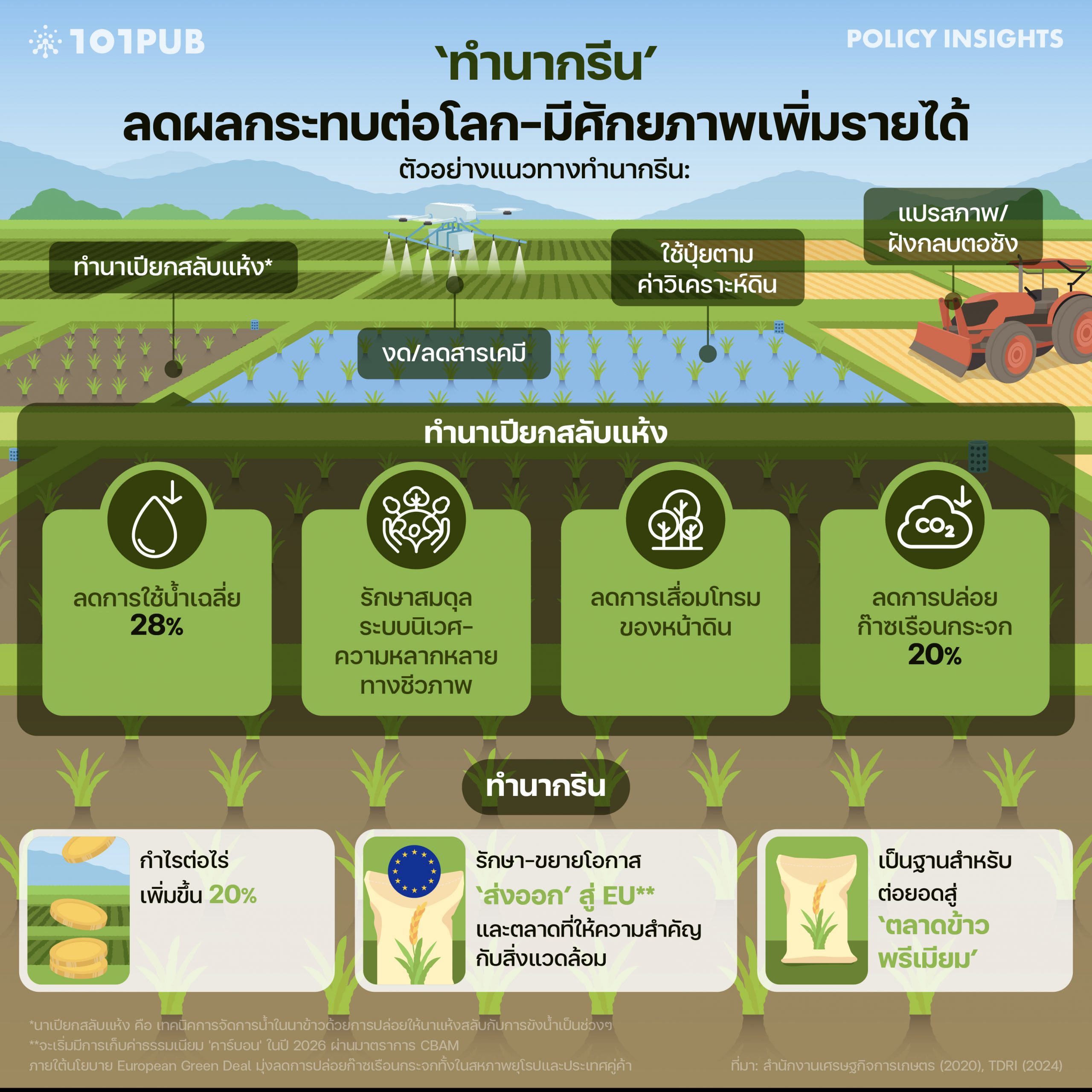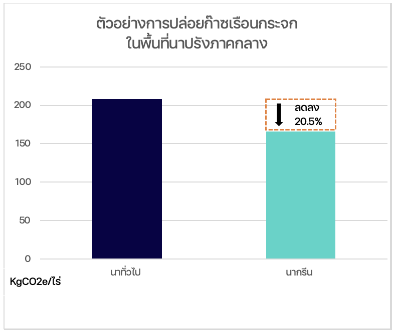 การทำนากรีนนั้นจะช่วยลดการปนเปื้อนของสารเคมีและรักษาความสมดุลของระบบนิเวศ ส่งผลให้ข้าวมีความทนทานแข็งแรงมากขึ้นและนำมาสู่เพิ่มผลผลิตต่อไร่ ด้วยการใช้วิธีทำนาแบบเปียกสลับแห้งยังทำให้ชาวนาสามารถลดการใช้น้ำได้ถึงร้อยละ 28 และลดการปล่อยมีเทนถึงร้อยละ 48[14]Nipon Poapongsakorn, “Making Exports for a Low-Carbon Era,” Thailand Development Research Institute (TDRI), Last modified April 1, 2024, https://tdri.or.th/en/2024/04/making-exports-for-a-low-carbon-era/