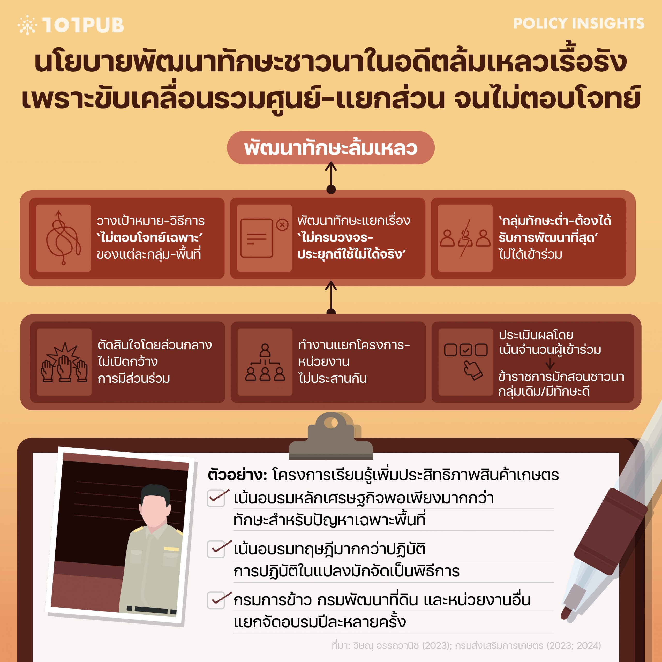 แม้ภาครัฐจะใช้งบประมาณจำนวนมากในการพัฒนาเกษตรกร แต่ผลลัพธ์ที่ได้ยังไม่คุ้มค่ากับการลงทุน โดยเฉพาะด้านการพัฒนาทักษะ ซึ่งยังประสบปัญหาเชิงโครงสร้างในลักษณะซ้ำเดิม ส่งผลให้การยกระดับศักยภาพชาวนาไม่ประสบความสำเร็จ