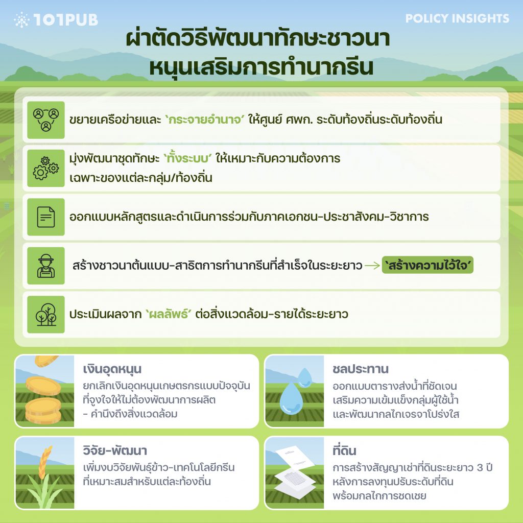รัฐจึงต้องบูรณาการนโยบายใหม่ ให้ชาวนาเป็นศูนย์กลางการเรียนรู้ สร้างแรงจูงใจ และการประเมินที่วัดผลได้จริง เปิดทางให้การทำนากรีนกลายเป็นทางเลือกหลัก ไม่ใช่เพียงโครงการนำร่อง การพัฒนาทักษะเพียงอย่างเดียวไม่เพียงพอ ต้องปรับโครงสร้างนโยบายโดยรอบไปพร้อมกัน ทั้งระบบอุดหนุน การชลประทาน งานวิจัย และความมั่นคงในที่ดินทำกิน